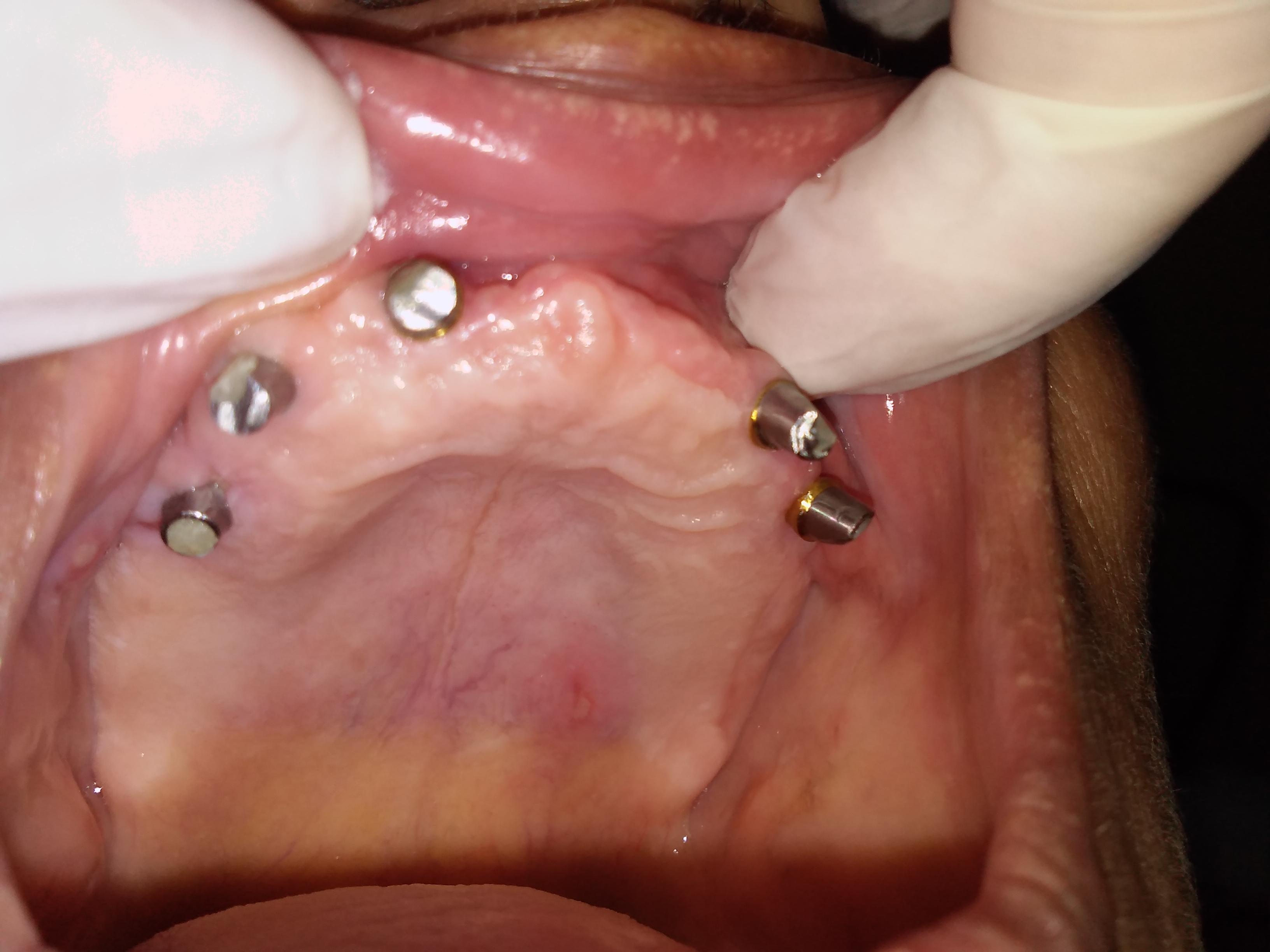 A 55 year old lady visited to our dental clinic for getting her teeth fixed. Medical history was taken and patient was fit for all the dental procedures. Dental history was taken and implants were noted in lower region of the jaw, 6 implants were placed and it has 12 teeth on on 6 implants. Implants were done at our clinic in 2011 using adin systems the implants were healthy and was perfectly in function. Detail radiographic examination were conducted which included OPG and CT scans, they revealed severely atrophic upper jaw. Treatment planning :we decided to restore upper jaw using all on four and an implant in addition, it was followed by giving temporary fix processes which will be used for six months and it is converted into a fixed prosthesis. Siting bone loss patterns and difficulty of the case we decided to restore it with help of osstem implant systems. Implants were placed and a temporary prosthesis is given on the same day. We waited for 6 months and give Cobalt chromium metal framework on which ceramic Crowns where luted.